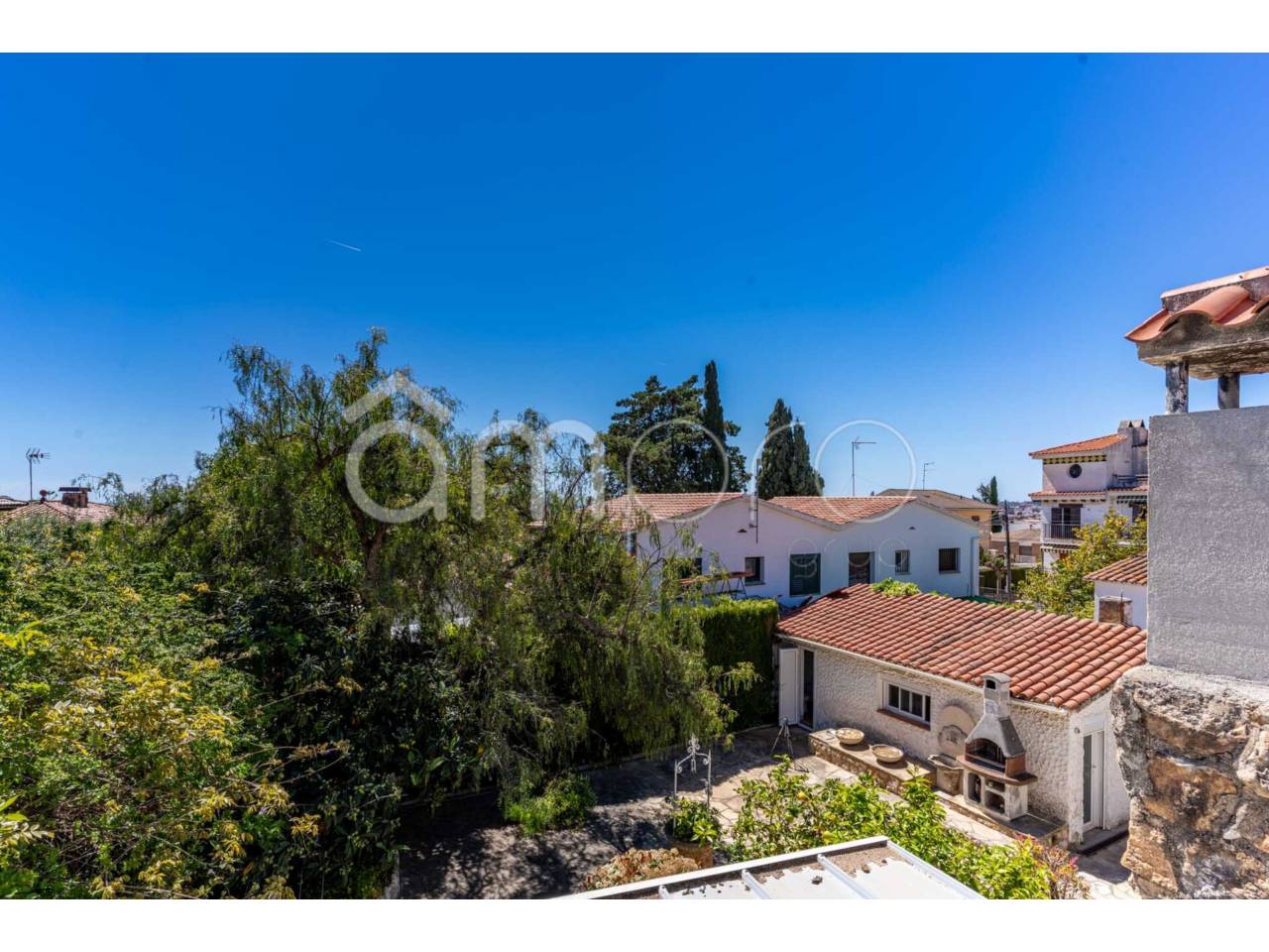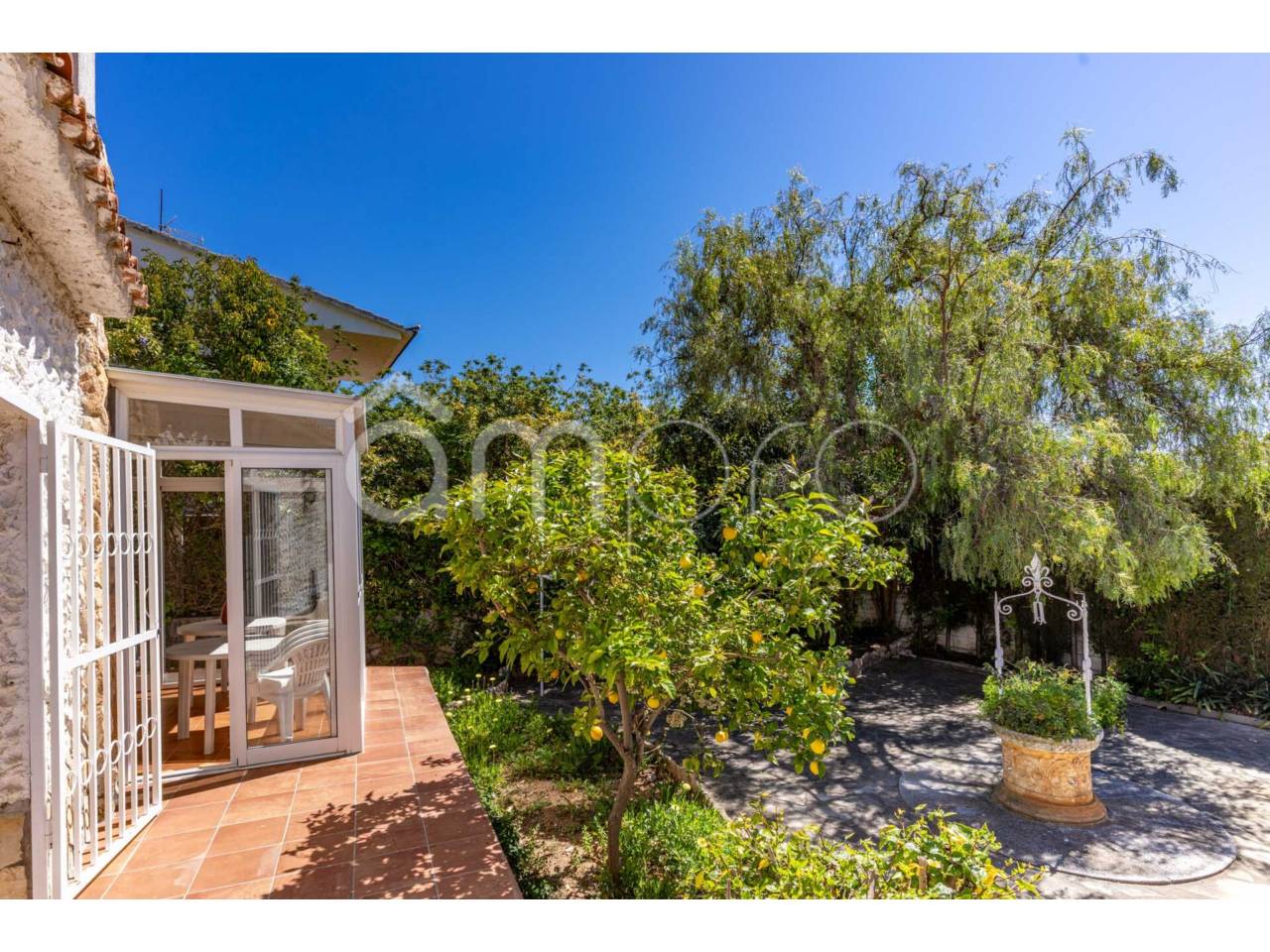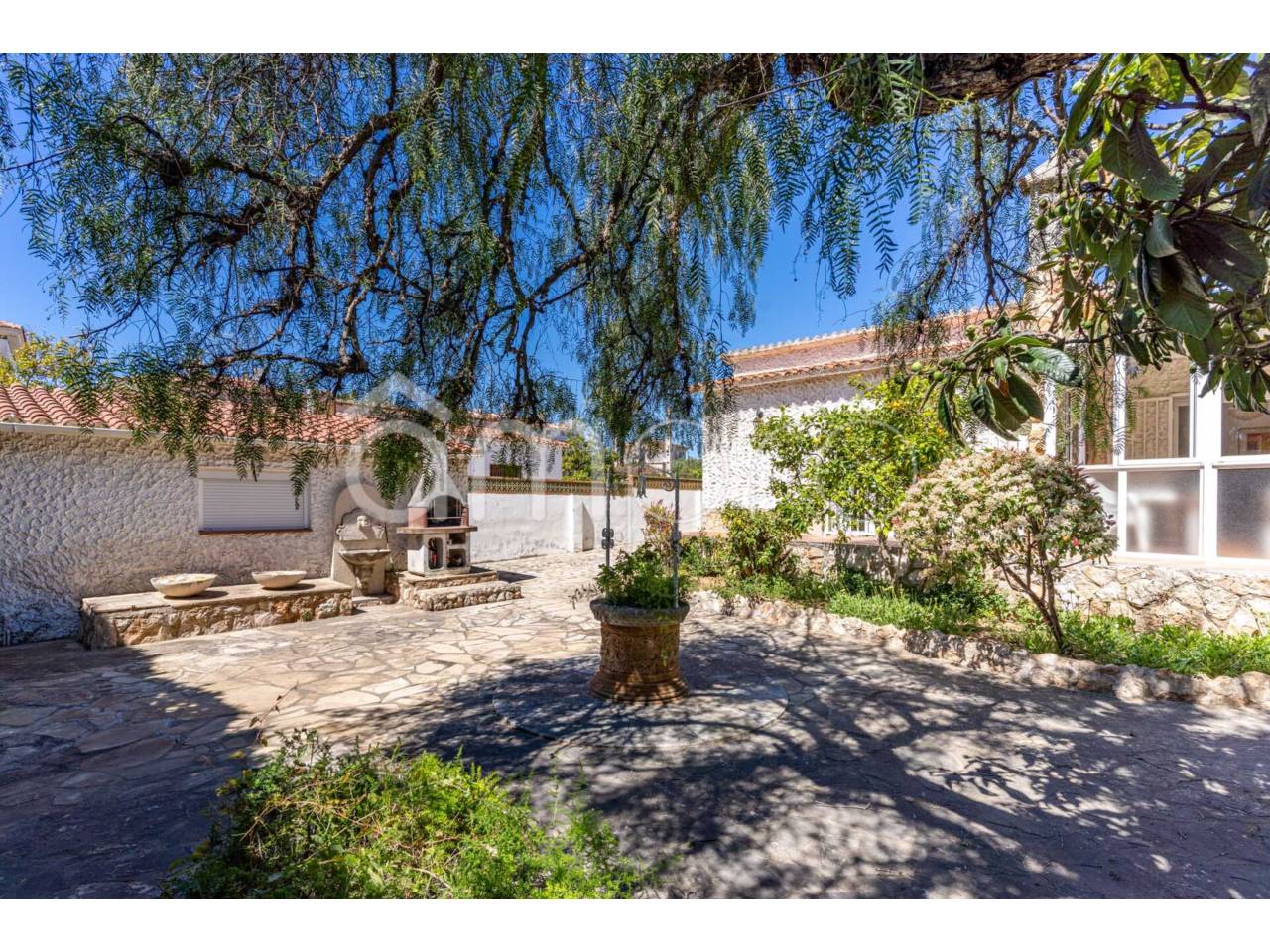En el jardín, encontramos varias zonas. Terraza, zona barbacoa, jardín con muchas posibilidades y zonas de sombra, además de una sala independiente muy amplia, que podría ser un dormitorio adicional o reformarlo y hacer un pequeño apartamento, ya que dispone de baño con plato de ducha.