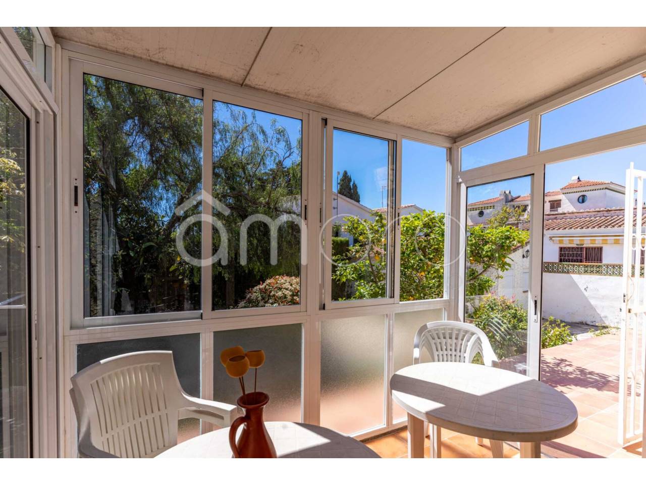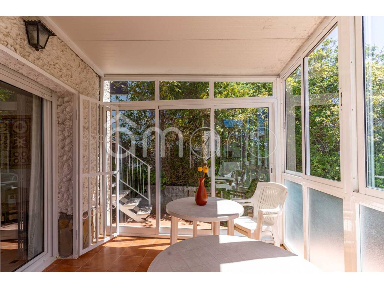 La casa, toda en una sola planta, se distribuye en amplio salón-comedor con chimenea y dos zonas, que dan salida al jardín y a un comedor-terraza cerrado con aluminio con preciosos ventanales que le dan mucha luz natural.