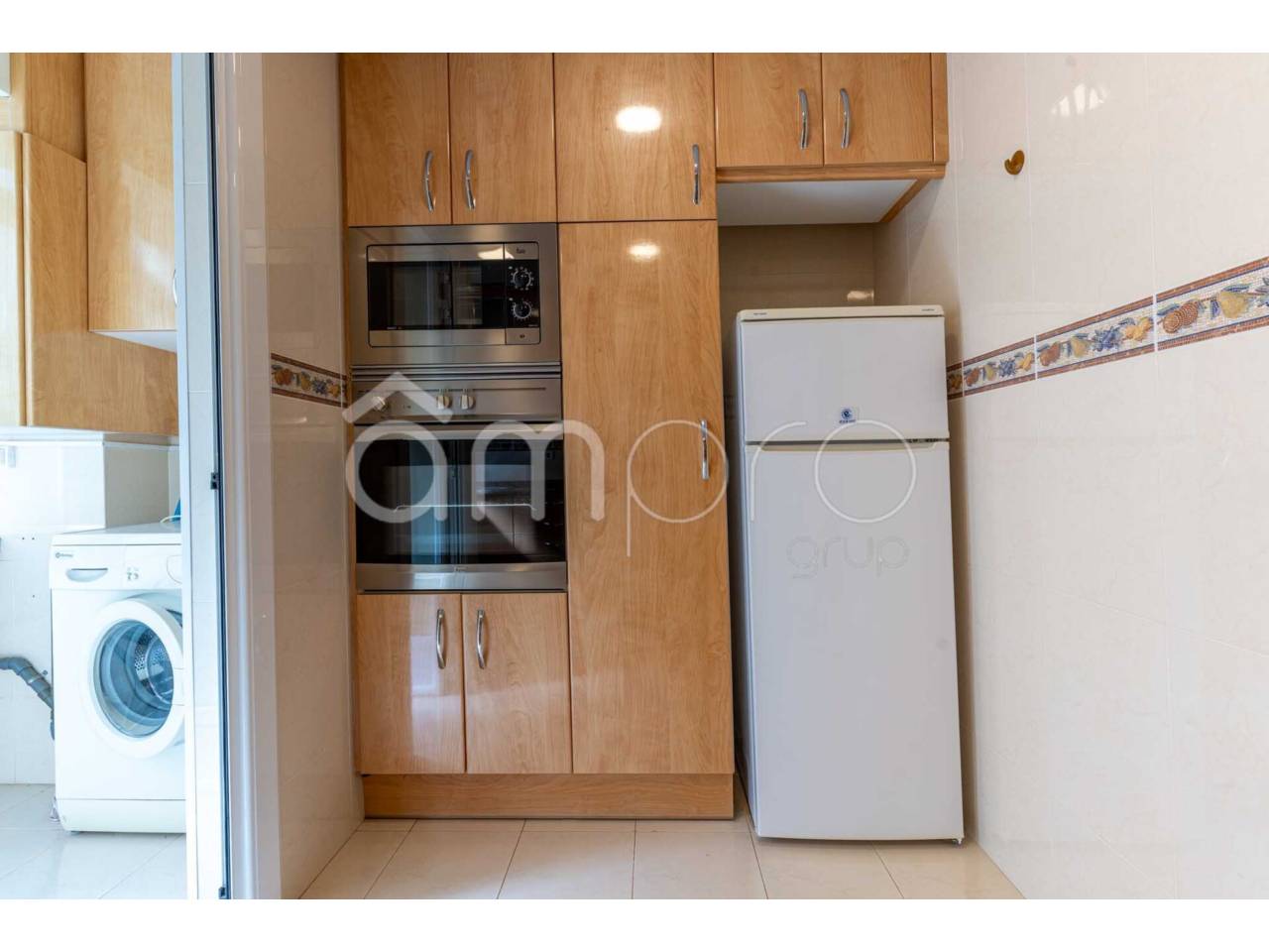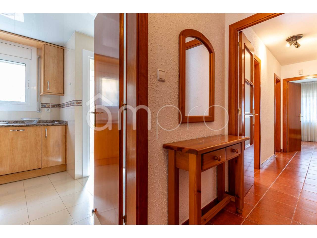 La zona de descanso está compuesta por tres dormitorios, uno doble y dos individuales, todos ellos equipados con armarios. La cocina es independiente y dispone de una práctica galería, además de un baño completo que da servicio a la vivienda.